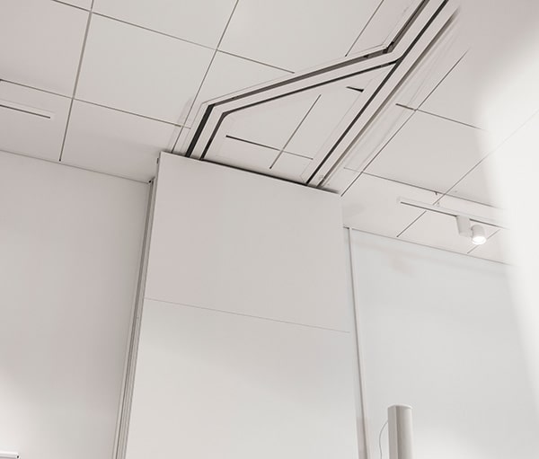 Disponível em múltiplos acabamentos — lacados, painéis decorativos, vidro — para que o sistema se integre ao visual do espaço arquitetónico. - Agilidade e economia