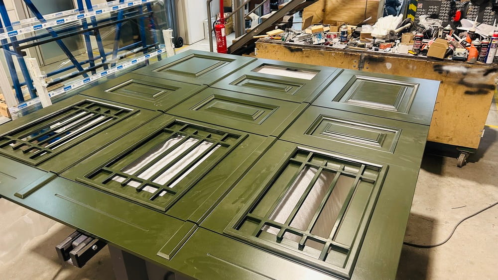 O principal desafio técnico consistiu em ajustar a dimensão dos ornamentos e das almofadadas à altura dos painéis, garantindo o correto funcionamento da porta sem comprometer a leitura estética da fachada.
